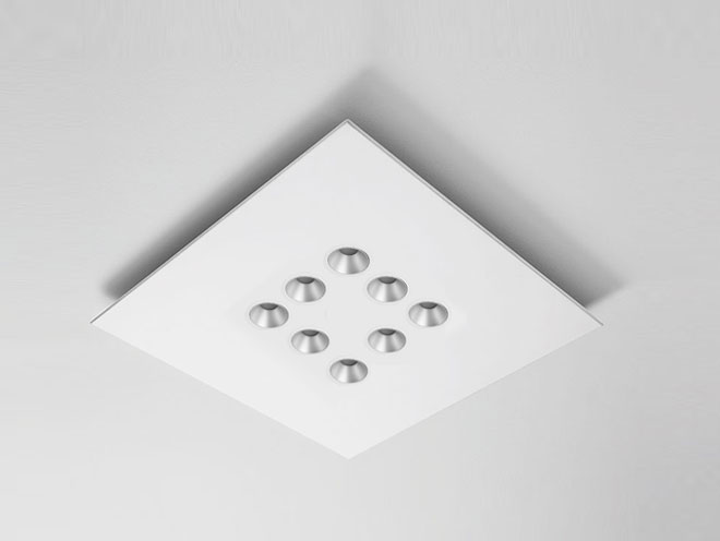 Die nur 4,5cm hohe Leuchte ist aus einer quadratischen, zu den Seiten angeschrägten Metallplatte gefertigt und birgt auf der sichtbaren Seite insgesamt 8 runde Vertiefungen, welche quadratisch im Zentrum der Platte ausgerichtet sind. Jede einzelne Vertiefung ist mit einem LED-Leuchtmittel versehen und wird mittels eines Diffusors gleichmäßig nach unten abgestrahlt. Als optisches Highlight sind die Innenseiten der Vertiefungen entweder hochwertig und glänzend veredelt, oder aber zurückhaltend und schlicht gefertigt. So lässt sich die Confort gleichermaßen als leuchtendes Designelement oder aber als zurückhaltende Lichtquelle integrieren.